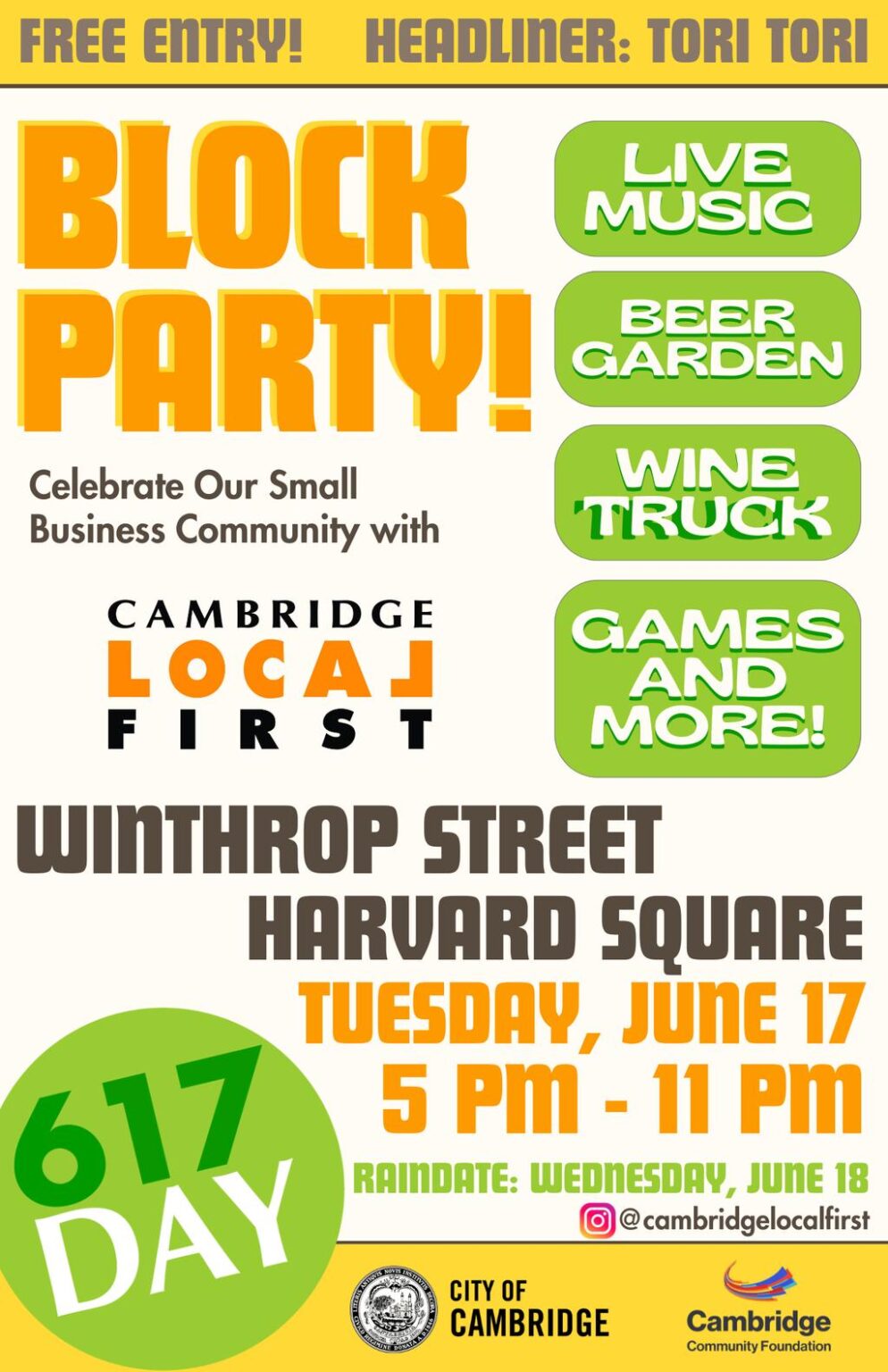 Lawn games, activites, Rosé truck, beer garden on Winthrop Street 5 to 10 pm. Free live entertainment on stage in Winthrop Park, featuring Boston's own ToriTori, FM Collective, and The Sunday Slippers, plus stand up comedy courtesy of The Comedy Studio. Entertainment starts at 6:30 PM and ends at 10:30 PM. Parkside dining available at Grendel's Den patio. After-party at The Comedy Studio.