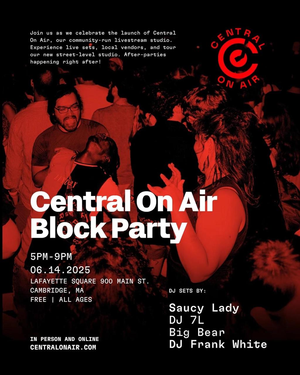 Get ready to experience The Central on Air Block Party, launched from the Central on Air Studio at 425 Mass Ave, with dancing happening right in Lafayette Square. Guests will experience four incredible DJs – Saucy Lady, Big Bear, and DJ Frank White – taking turns to kick off this exciting event, bringing the party to you both online and in real life. And the music doesn't stop there: they can join them for exclusive after-parties at Middlesex Lounge, Roxy's, and Brick & Mortar, ensuring Central Square is filled with non-stop music all night long!